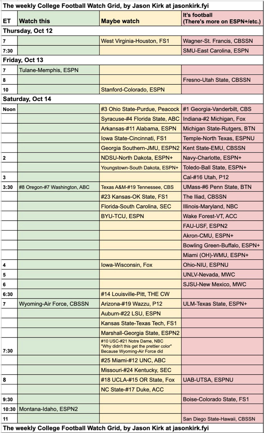 The biggest game of the week will also somehow gain you a few hipster credentials. The Pac-12 is old and has long had power status, sure, yet it’s limited edition, it’s soon to be small-batch, and it regularly broadcasts games on a channel you’ve likely never seen. More importantly, the Oregon-Washington rivalry winner will have a strong case for #1 votes, considering this season’s wide range of potential top teams and the fact that Georgia’s only played one truly impressive game so far.